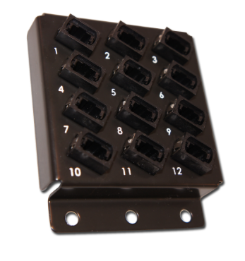 MTP® bracket designed for newer mainframes to inter-connect up to 12 MTP® direct-attach harnesses with MTP® trunks. Ports are silkscreened 1 through 12. Also, can be used as a basic mating point for MTP® trunks and harnesses in an equipment rack or cabinet. **Equivalent to IBM p/n 45D6787**